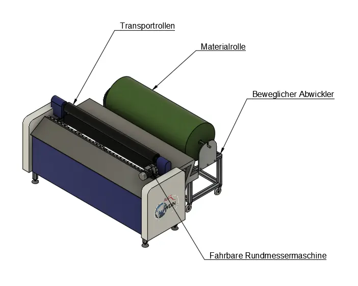 Die Materialrolle wird auf dem Abwickelwagen platziert. Der auf Rollen befindliche Abwickelwagen wird vor dem Cutter in die Aufnahmen positioniert. Das Material wird in die Maschine eingeführt. Durch Eingabe von Länge, Stückzahl, Anzahl Schnitte, Vorschubgeschwindigkeit, Schneidgeschwindigkeit kann die Maschine optimal für den benötigten Anwendungsfall eingestellt werden. Die Maschine fördert das Material automatisch vor und schneidet das Material auf die gewünschte Länge. Dank der Doppel-Schneidtechnologie ist das Rundmesser in der Lage in beide Richtungen zuschneiden, was einen deutlich höheren Output generiert. Durch einen Materialenderkennungssensor stoppt die Maschine automatisch, wenn das Materialende erkannt wird. Die zuschneidenden Materialien müssen vorher definiert werden.