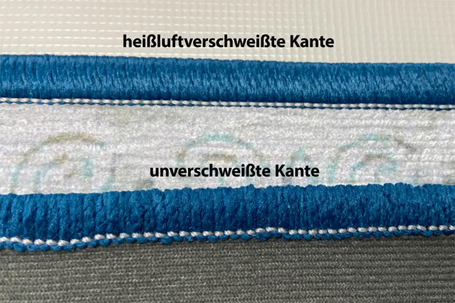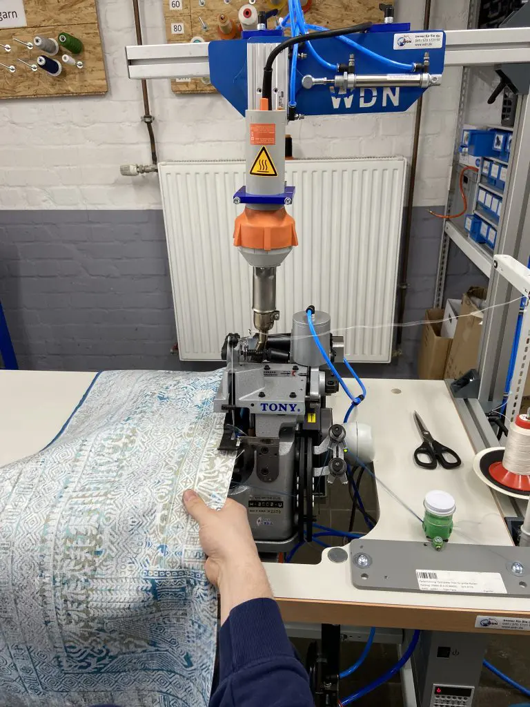 Nachrüstung einer kombinierten Heißluft/Verpresseinrichtung an einer Teppichkettelmaschine. Dazu wird an die Maschine ein separater Puller (Walze oben und unten) montiert, der den Teppich synchron mit der Maschine transportiert und die Naht verpresst. Vor dem Puller wird ein Heißluftschweißarm mit eigener Temperatursteuerung und spezieller Düse montiert. Der Heißluftschweißarm kann separat von der Maschine geschaltet werden und schwenkt automatisch ein, wenn die Maschine näht und schwenkt wieder aus, wenn der Nähvorgang unterbrochen wird.