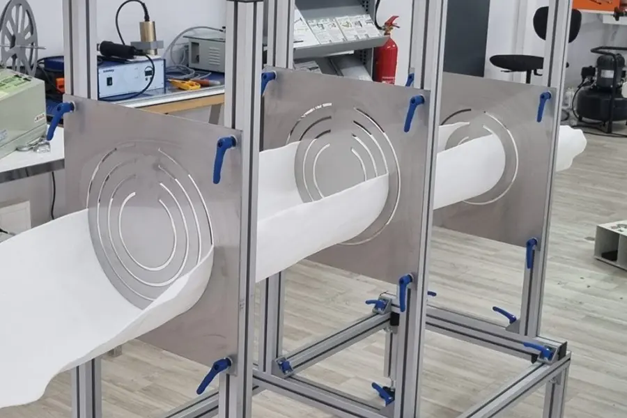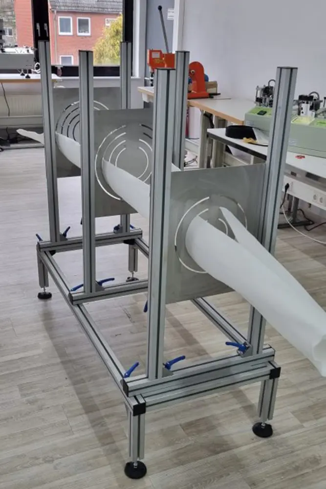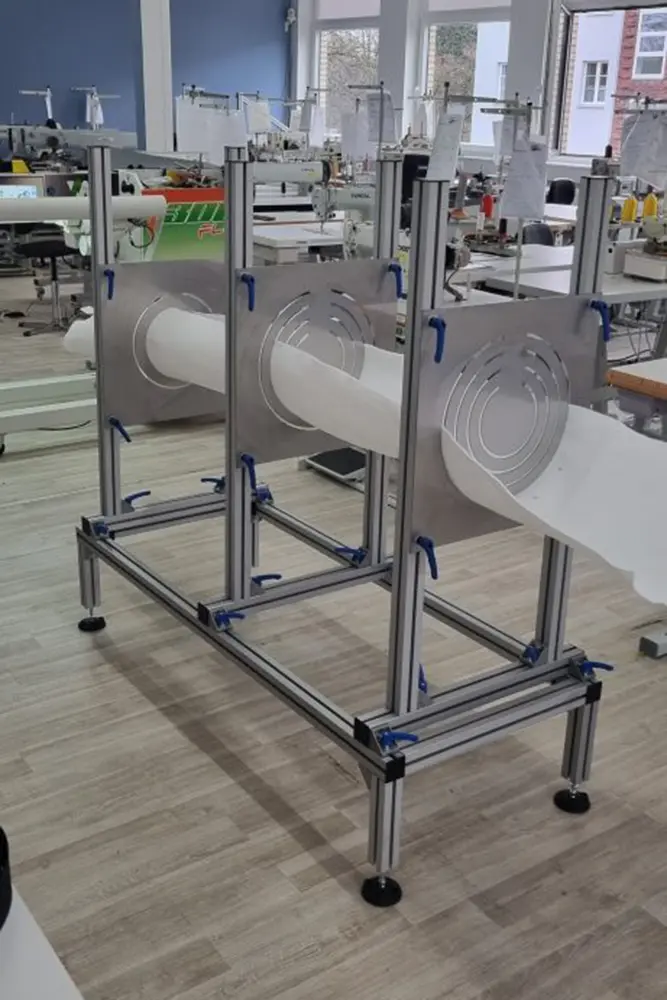 Der Materialformer formt das flachliegende oder von der Rolle kommende Material zu einem Schlauch. Über drei Führungsscheiben wir das Material schrittweise geformt. Die Führungsscheiben sind in X/Y/Z Achse frei einstellbar. Durch unterschiedliche Ausschnitte sind verschiedene Schlauchdurchmesser möglich.